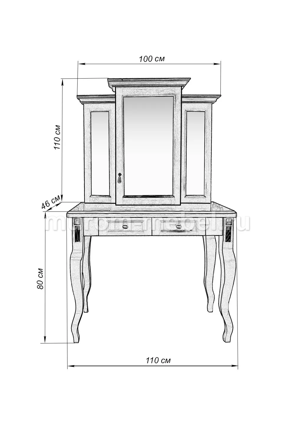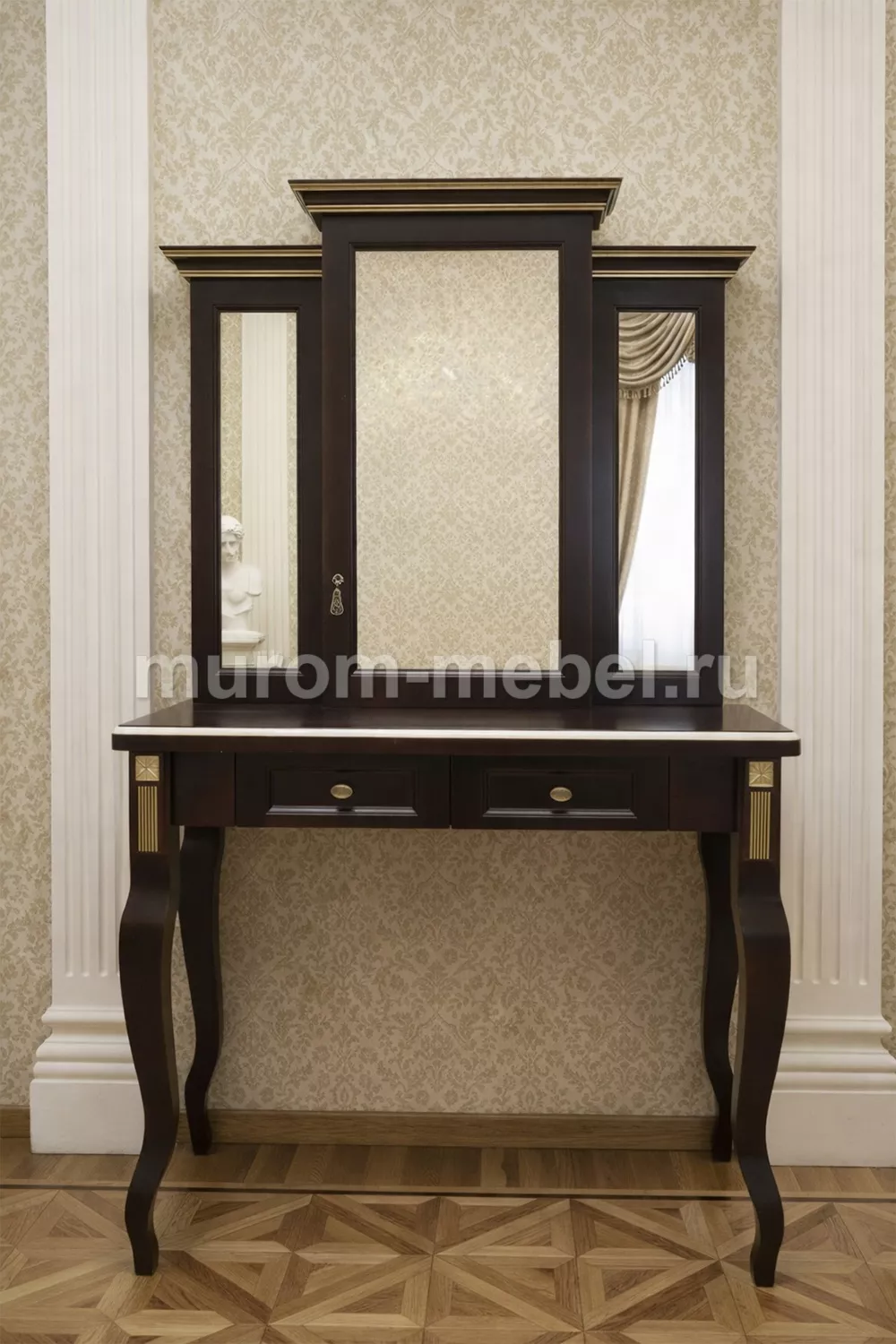 Дамский столик Грета - утонченное изделие, которое обязательно станет украшением в вашей спальне. Отличием данного женского стола является наличие трех зеркал. Посредством этого можно увидеть себя с разных сторон, что очень удобно. При этом, большое количество зеркал способно визуально увеличить комнату. Внимания заслуживают и необычные ножки, которые имеют плавные изгибы. Смотрятся они хрупко, но отличаются надежностью. Столик оснащен двумя выдвижными ящиками и широкой поверхностью, где можно разложить косметические средства в удобном порядке.