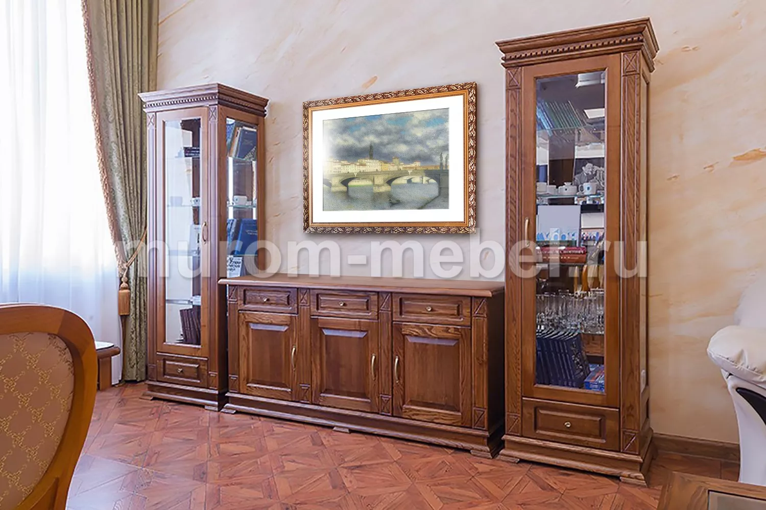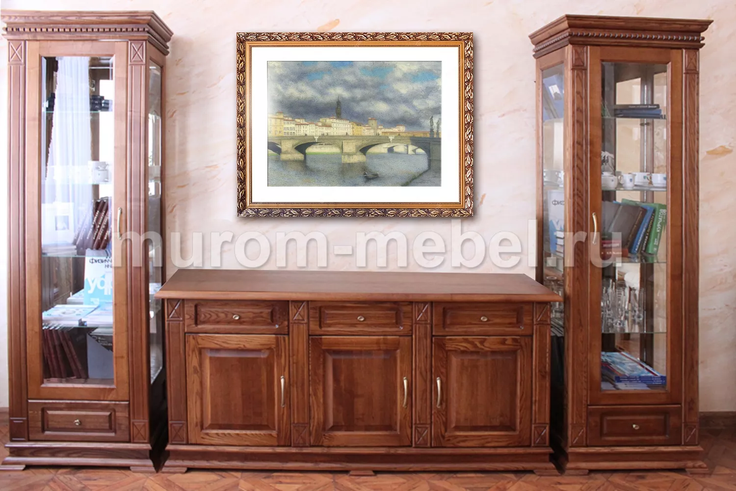 Представляем Вашему вниманию мебельный гарнитур Флоренция-5 для гостиной, выполненный в едином классическом стиле. Он состоит из трёх предметов: двух одинаковых шкафов-пеналов и достаточно вместительной тумбы. Шкафы снабжены полочками, на которых можно разместить книги, музыкальные пластины, необычные растения и статуэтки за стеклянной распашной дверкой. Тумба, объединяющая комплект, имеет хороший функционал. Конструкторы снабдили ее и выдвижными ящиками на направляющих, и полочками за распашными непрозрачными дверками для скрытного хранения вещей. Резные украшения и подходящая фурнитура дополняют этот гарнитур. Флоренция-5 достойно займёт своё место в интерьере комнаты.