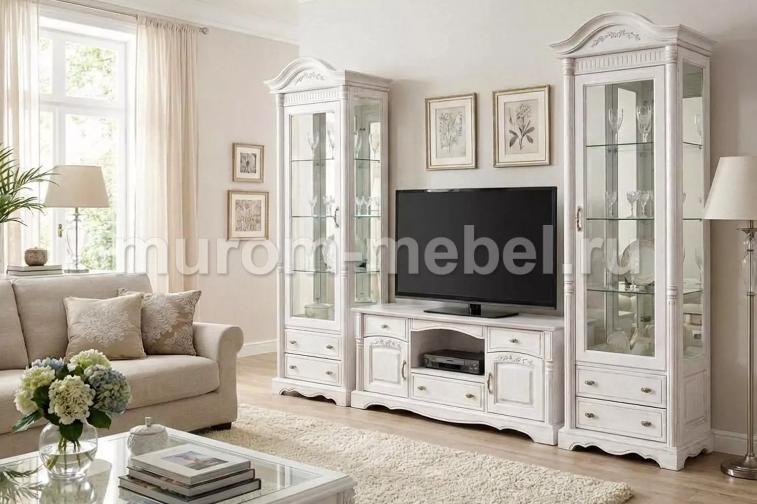 Комплект включает в себя 2 высоких, узких серванта и тумбу под ТВ. Для хранения предусмотрены полки за прозрачными дверцами, шкафчики и выдвижные ящики.