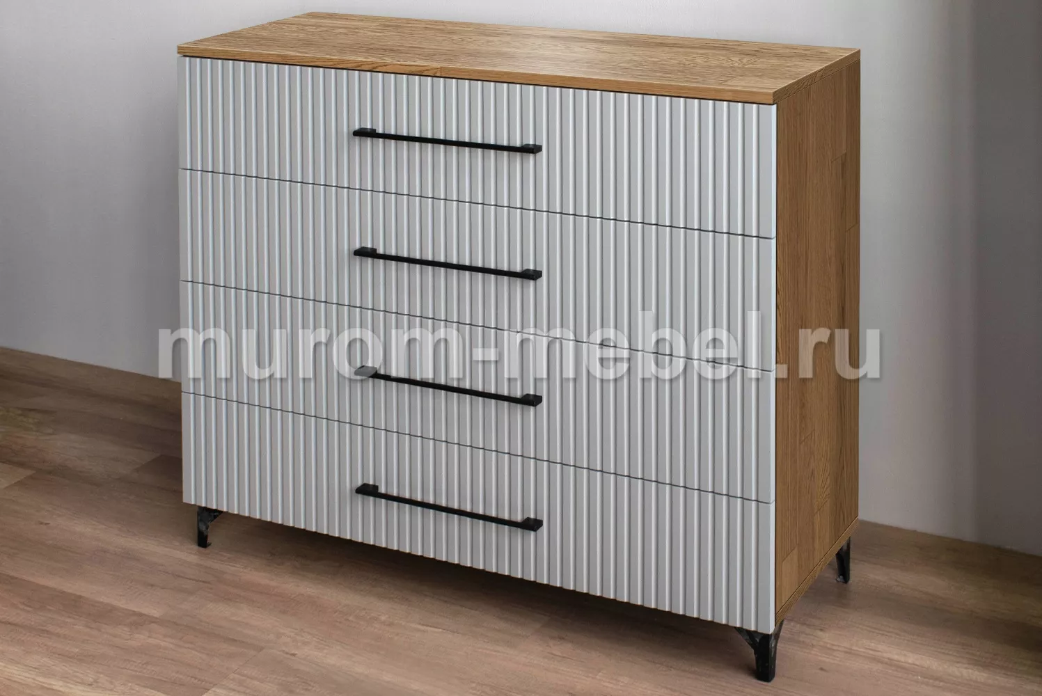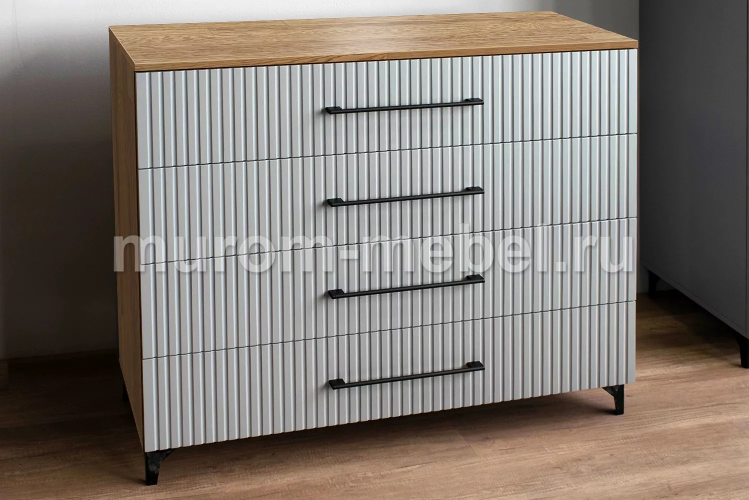 Стильный комод Борджия выполнен в стилистике 60-х годов, так популярных сейчас. Подойдет для меблировки как современного, так и классического интерьера. Модель имеет лаконичный внешний вид, дополненный резными элементами на фронтальной части. Конструкция стоит на высоких металлических ножках и оснащена четырьмя глубокими выдвижными ящиками. Плавность при открытии и закрытии придают крепкие направляющие. Благодаря использованию качественных материалов, изделие гарантированно прослужит долгие годы. При оформлении заказа можно изменить оттенок изделия и подобрать иную фурнитуру.