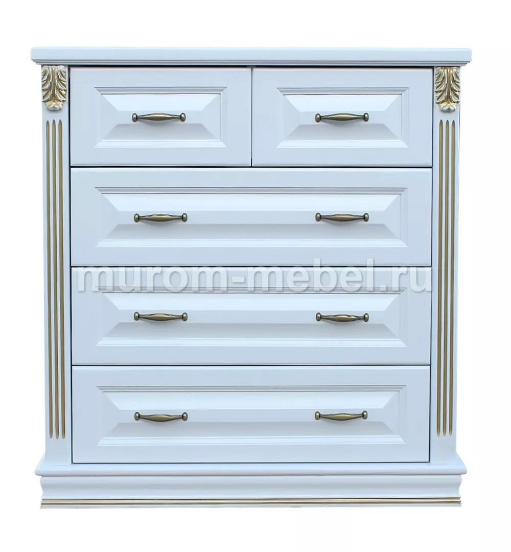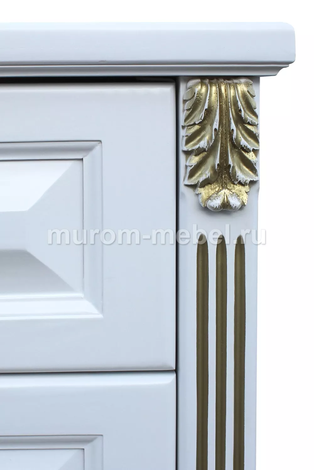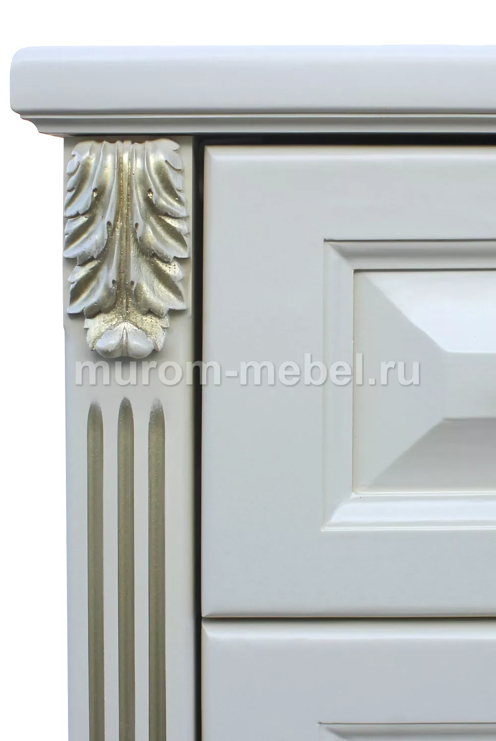 Общий вид представленной модели комода имеет достаточно грациозный и изысканный внешний вид. Дизайнеры продумали оформление такого предмета мебели до малейших деталей, чтобы сделать его действительно уникальным и достойным самых красивых интерьеров. Благодаря такому комоду даже самая обычная и простая по оформлению комната сразу заиграет по-новому. Благодаря такому оформлению фасада, как объемный резной узор, а также вертикальным прорезным линиям по бокам, и, конечно же, золоченому покрытию такого декора, представленная модель идеально подходит для интерьера в классическом стиле. К тому же представленная конструкция не только кажется возвышенной, но таковой по высоте и является за счет добавления верхнего уровня выдвижных ящиков, достаточно толстой столешницы и дополнительной подставки.