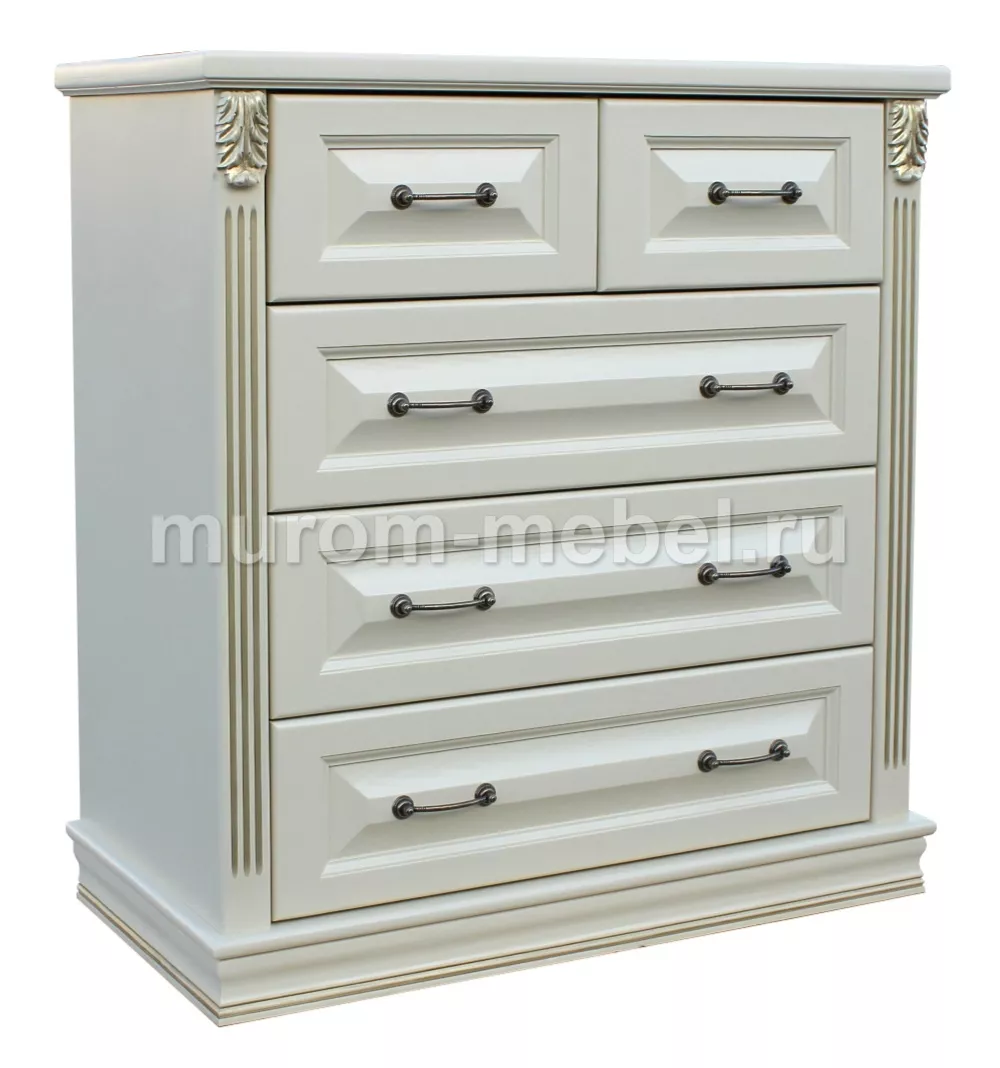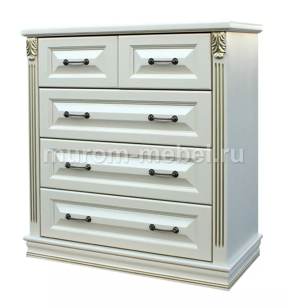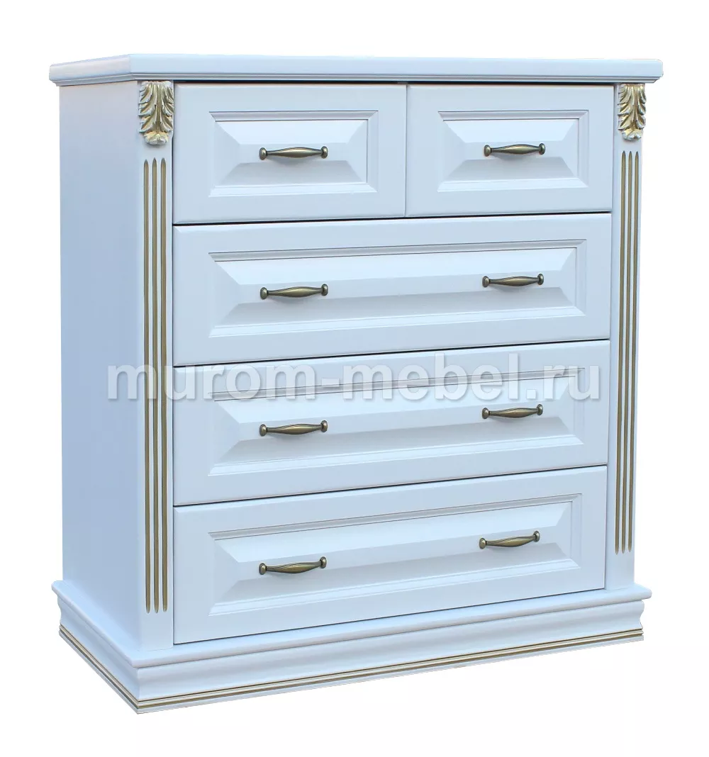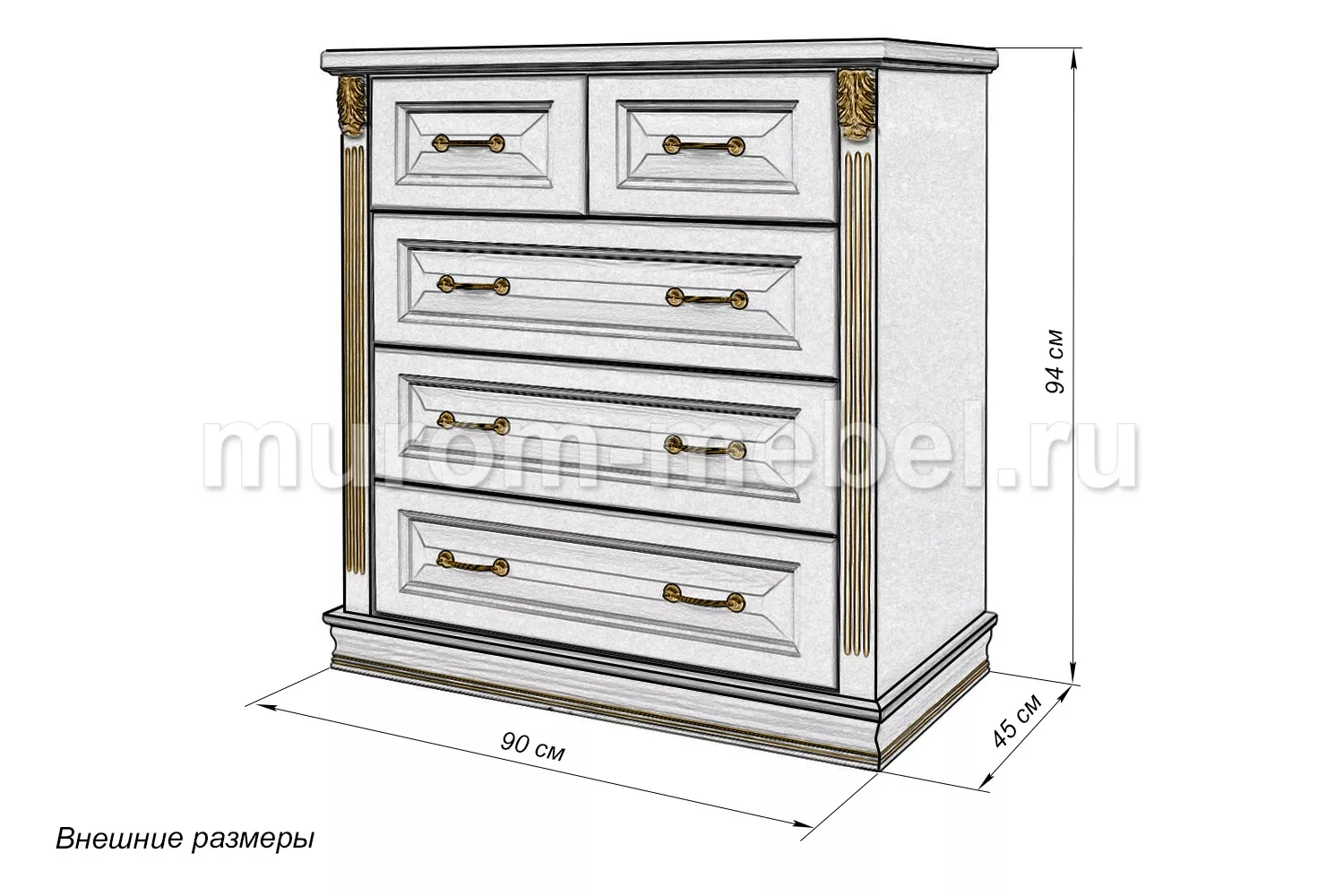 Общий вид представленной модели комода имеет достаточно грациозный и изысканный внешний вид. Дизайнеры продумали оформление такого предмета мебели до малейших деталей, чтобы сделать его действительно уникальным и достойным самых красивых интерьеров. Благодаря такому комоду даже самая обычная и простая по оформлению комната сразу заиграет по-новому. Благодаря такому оформлению фасада, как объемный резной узор, а также вертикальным прорезным линиям по бокам, и, конечно же, золоченому покрытию такого декора, представленная модель идеально подходит для интерьера в классическом стиле. К тому же представленная конструкция не только кажется возвышенной, но таковой по высоте и является за счет добавления верхнего уровня выдвижных ящиков, достаточно толстой столешницы и дополнительной подставки.