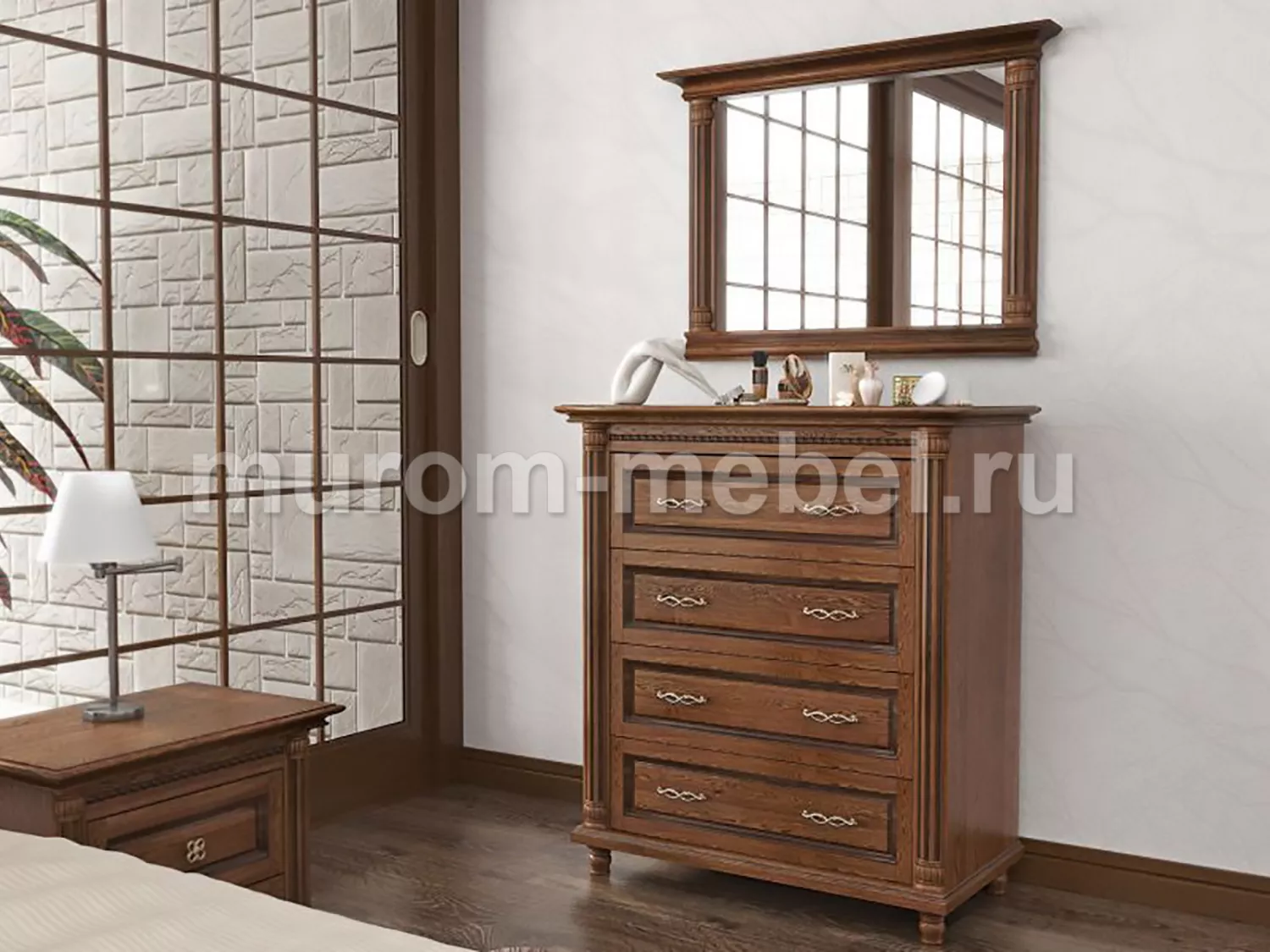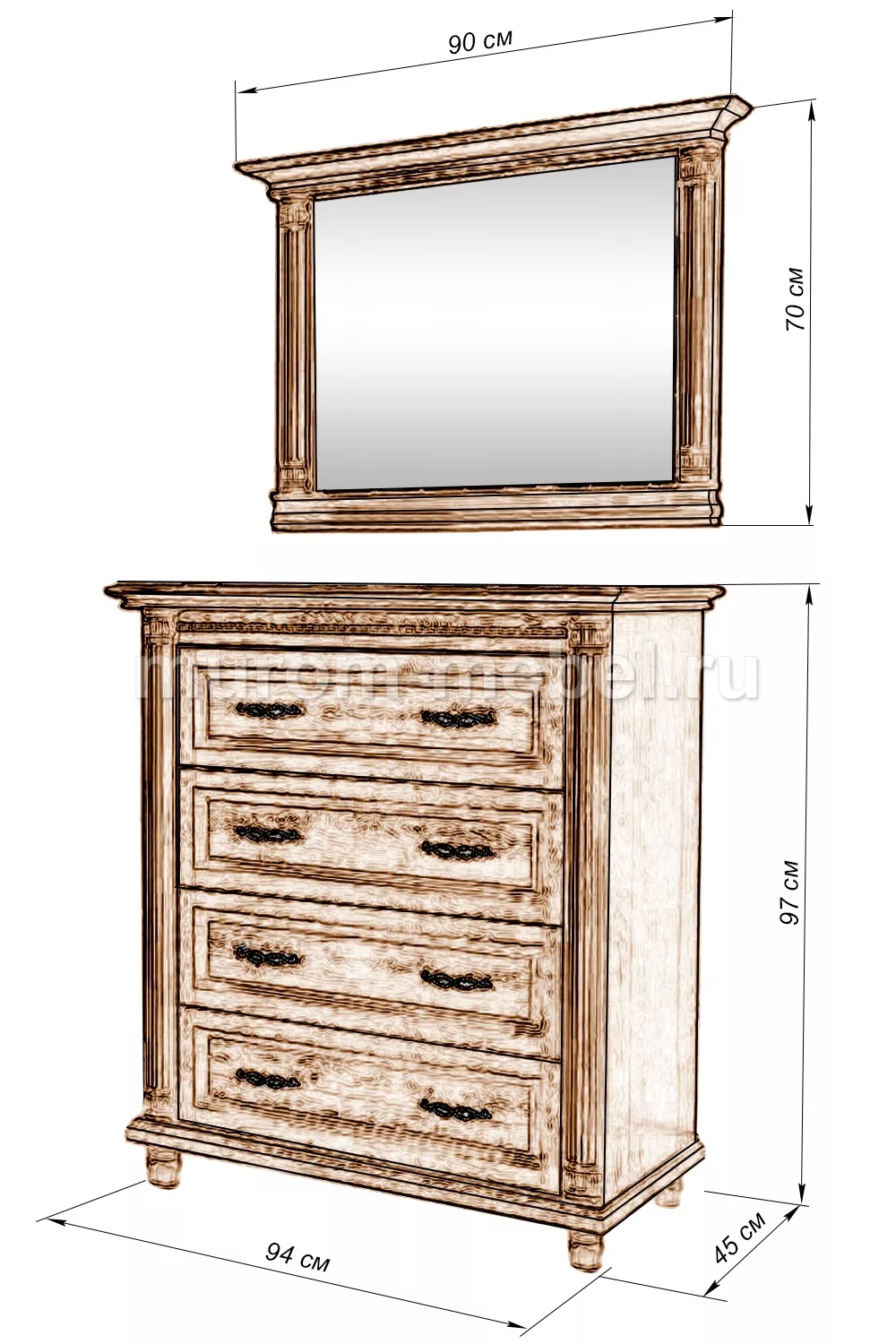 Представленный комплект включает в себя вместительный комод и большое зеркало. Первый предмет мебели оснащён 4-мя широкими ящиками на роликовых направляющих, которые открываются плавно и бесшумно. Они встроены в прочную конструкцию, выдерживающую повышенную нагрузку. Стоит она на надёжных ножках, обеспечивающих устойчивость.