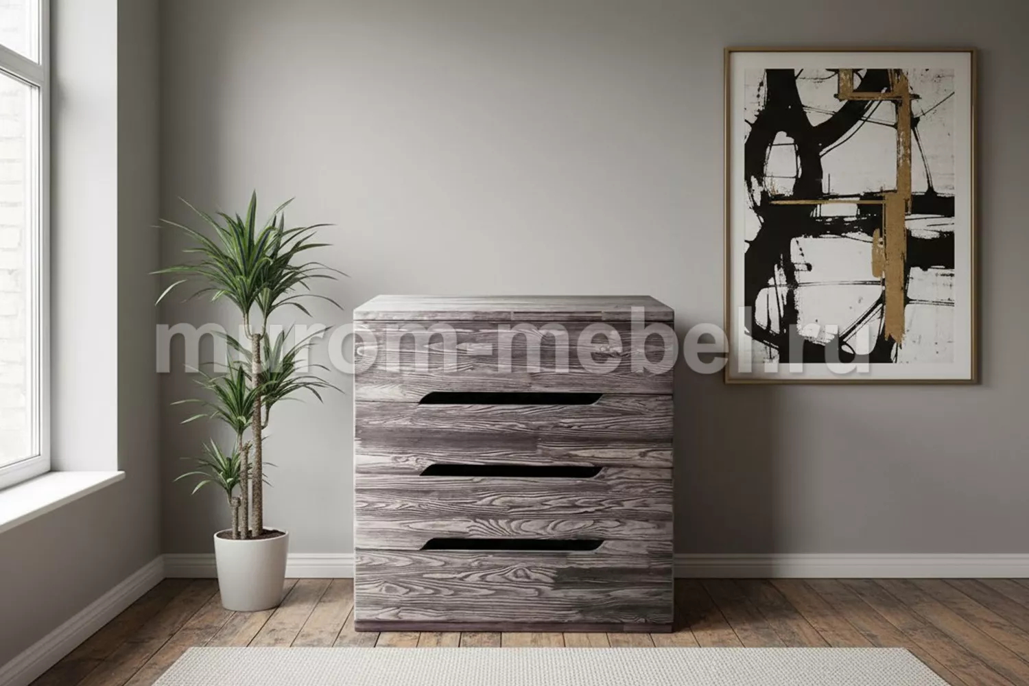 Дизайн комода простой, а способ окрашивания у модели на фото крайне необычен, поэтому она выглядит современно и интересно. Оттенок древесины покупатели могут выбрать самостоятельно. В каталоге представлена широкая цветовая палитра. Роль ручек выполняют небольшие отверстия, поэтому фурнитура на фасадах не нужна.