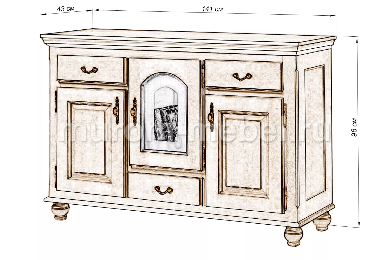 Винтаж 10 – необычный предмет мебели, в котором объединяется роскошный внешний вид и практичность. Для хранения предусмотрены выдвижные ящики и полки, установленные за распашными дверцами. Верхнюю часть комода также можно полезно использовать. Например, под телевизор, семейные фотографии, лампу и т.д.