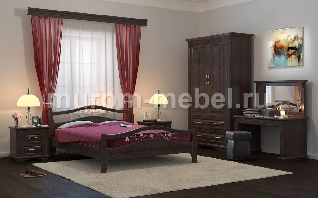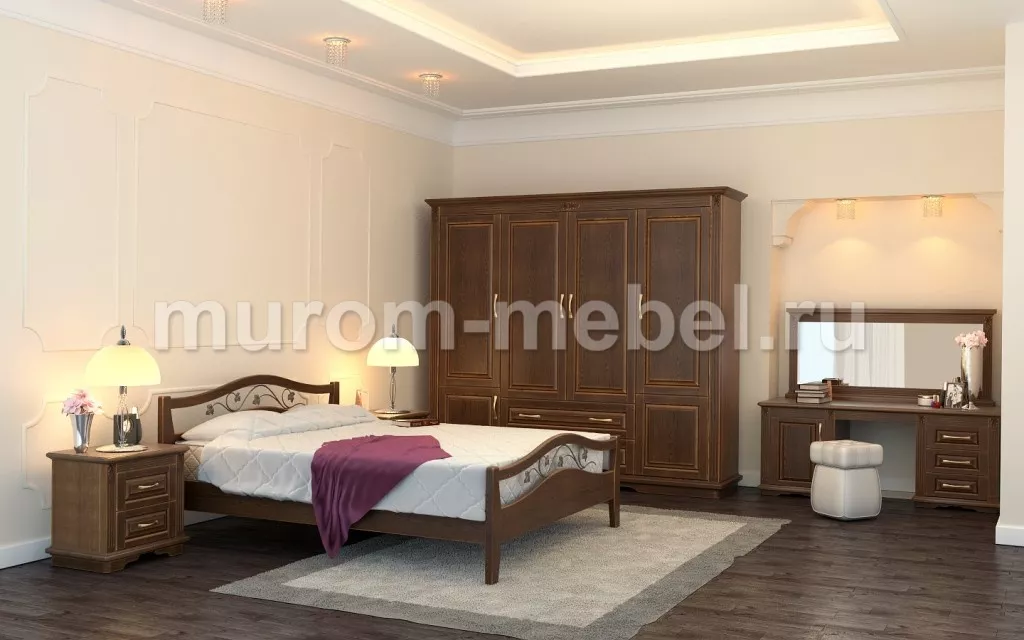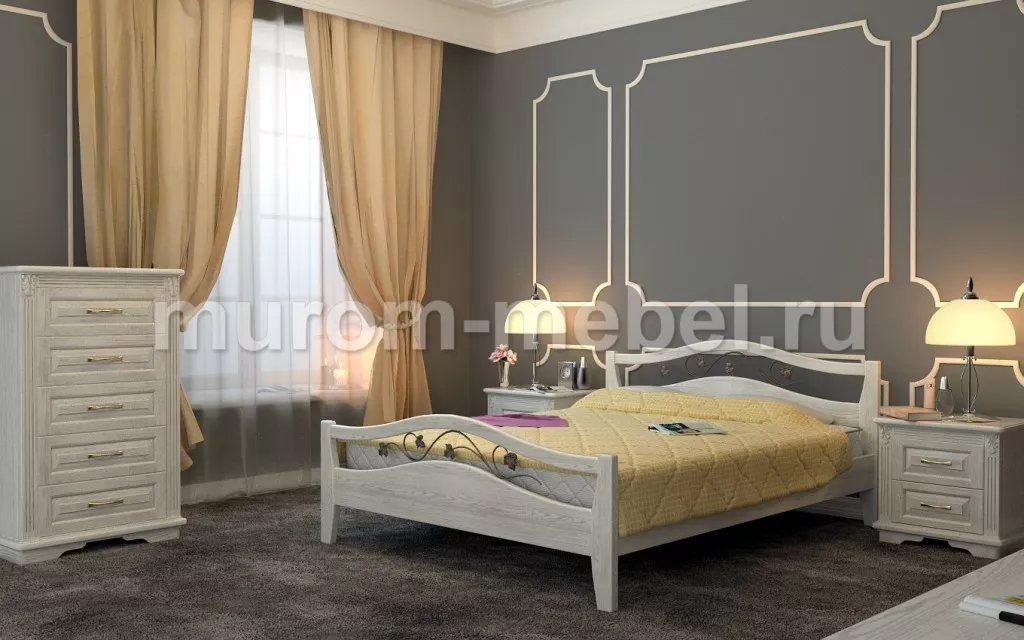 Кованые элементы подчеркивают грацию дизайна и привлекают внимание. Благодаря их использованию кровать не выглядит слишком массивной, поэтому она удачно впишется даже в современный интерьер спальни.