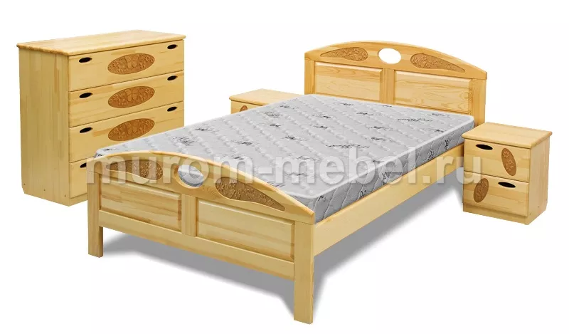 Кровать «Галатея» (сосна) имеет просто безупречный и можно даже сказать «романтичный» внешний вид. А все за счет использования светлого деревянного материала сосны и уникальных, и без излишества оформленных, спинок кровати. Задняя спинка кровати является немного выше передней, но дизайн у них одинаковый. Все изящество дизайна спинки заключается в ее полукруглой верхней части, которая посредине имеет сквозной вырез в форме эллипса, а по его бокам присутствует тончайшая робота, а именно вырезанная картинка из дерева в форме цветов различных размеров и бабочек, которые как будто посажены в вырезанное обрамление в форме капли.