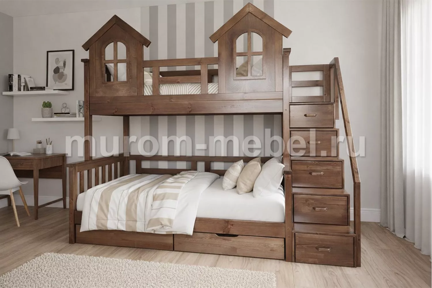 Кровать Сказка с верхним ярусом, оформленным в виде маленького замка, подойдет для установки даже в тесной детской. Поскольку модель функциональна и не занимает много места.