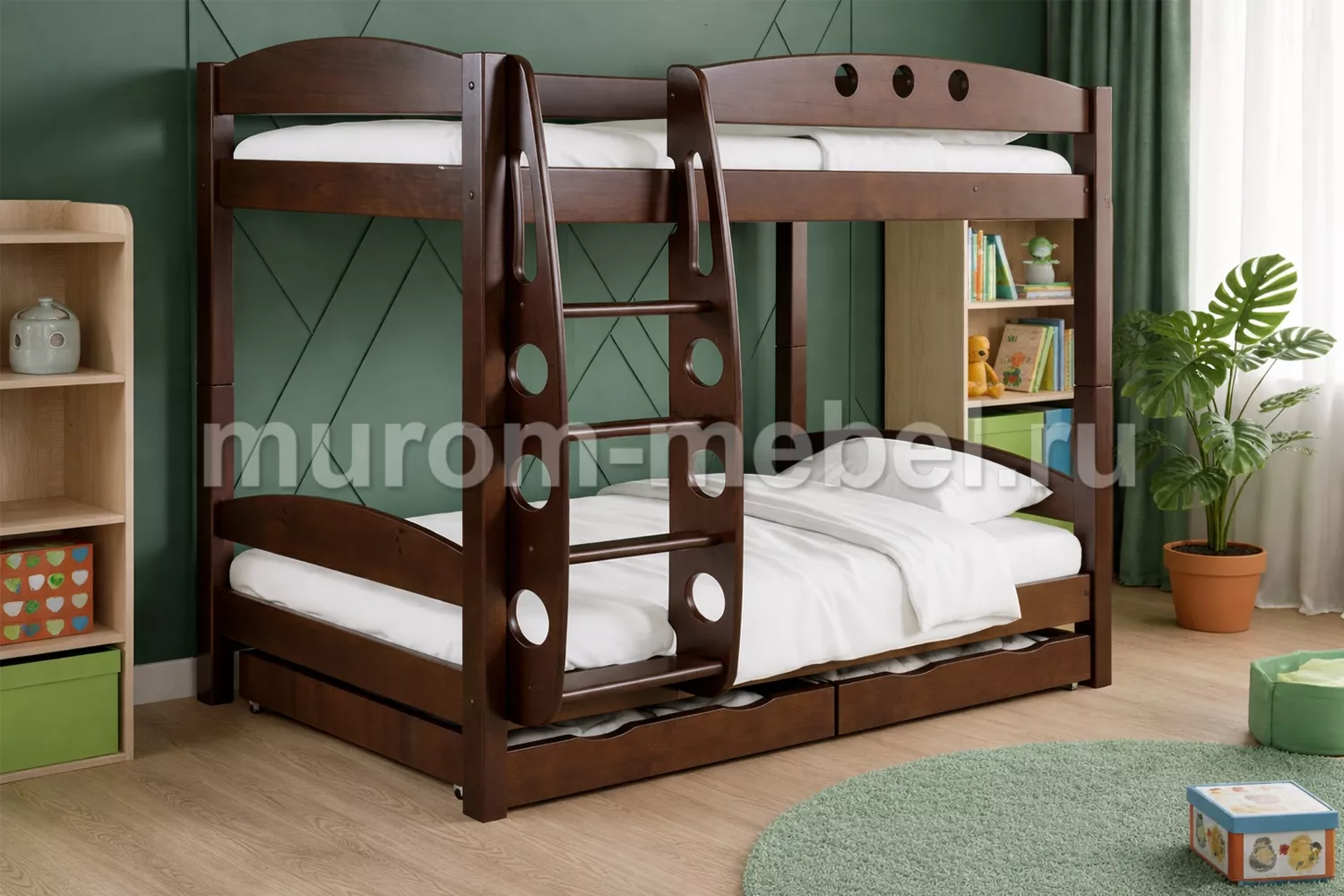 Кровать Жираф оборудована двумя ярусами. Подняться на второй этаж можно по удобной и прочной лестнице. Она не слишком высокая, поэтому родители могут не опасаться за безопасность своего ребёнка. Дизайн классический, а функциональным украшением выступают маленькие отверстия округлой формы.