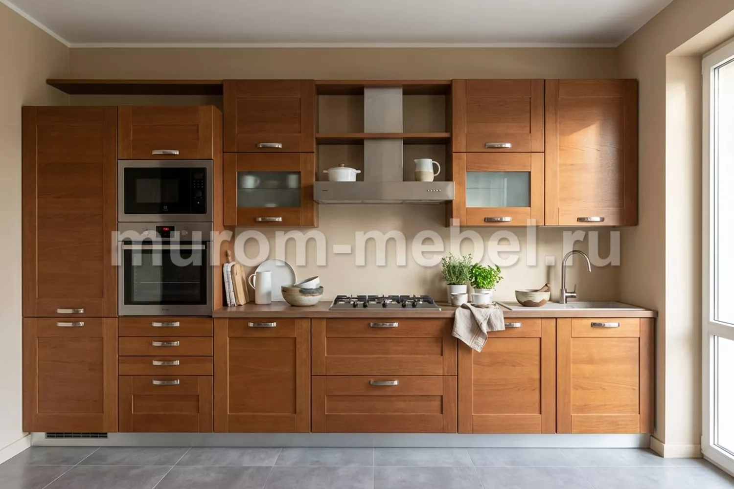 Кухня Модена - это функциональное решения для современной меблировки помещения. В производстве используются только качественные материалы, а именно древесный массив и крепкая фурнитура, способная выдержать высокие нагрузки. В состав гарнитура входят ящики на бесшумных направляющих, ниши и полки за дверцами, пространство для встроенной техники. Украшением выступают стеклянные вставки на дверцах и уникальная текстура древесины. Изделие имеет минималистичный дизайн и красивые ручки, которую можно выбрать в карточке товара. Там же можно ознакомиться с доступными к заказу оттенками дерева.