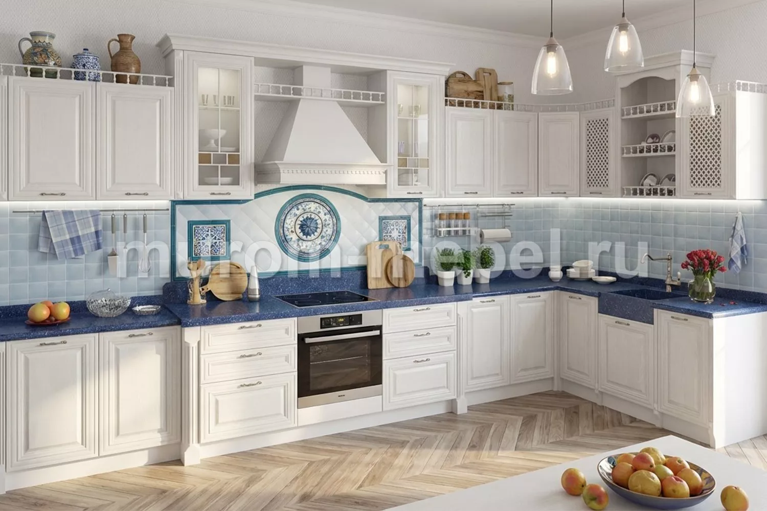 Дизайн кухни Валерия уникален, так как имеет несколько особенностей. Актуальное сочетание темно синего и белого придает кухне изящество и свежесть. Удобный и вместительный кухонный гарнитур Валерия будет радовать каждую хозяйку.