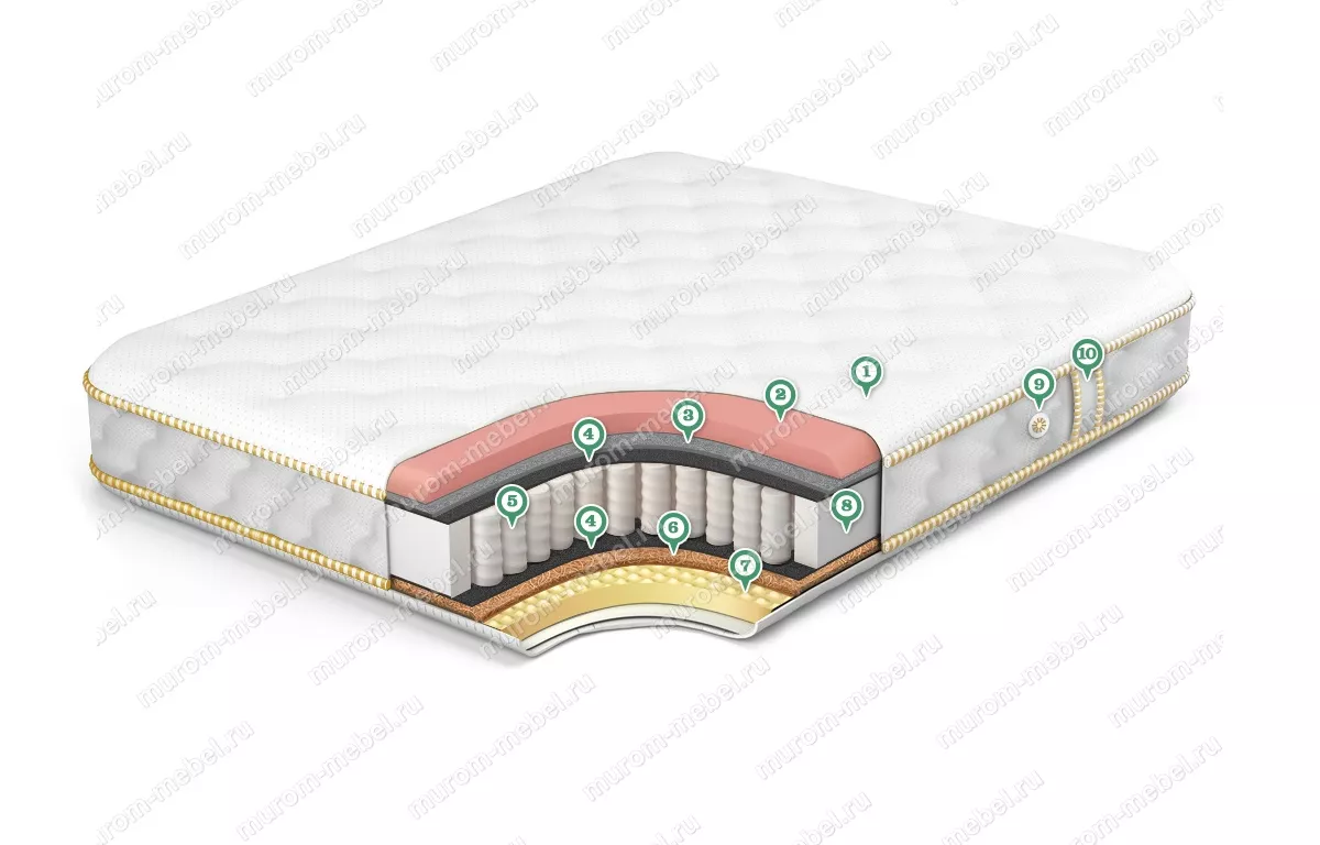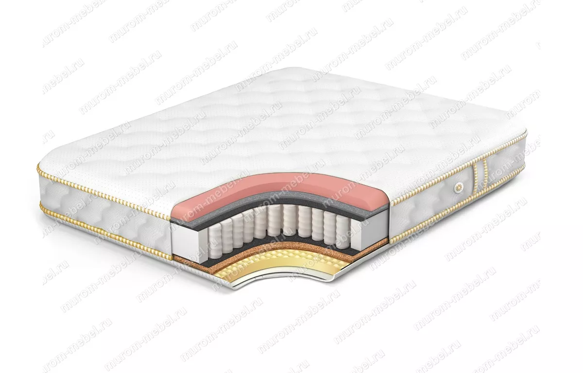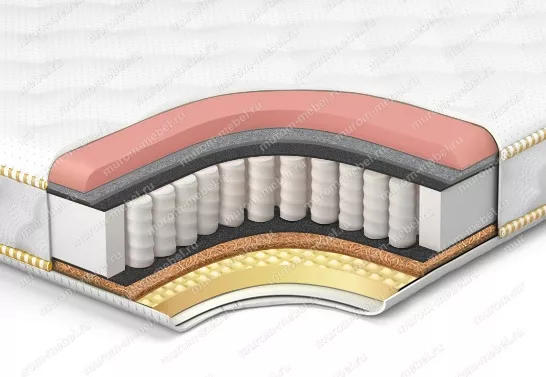 Данная модель выполнена из кокоса, мемори форм, войлока, спанбонда, латекса и ППУ. А её основой является блок пружин, в котором каждая отдельная деталь имеет свой чехол и обеспечивает тем самым равномерное распределение нагрузки и точное повторение контуров человеческого тела.