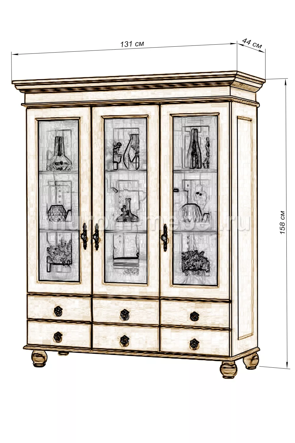 Ищете стильный сервант, изготовленный из натуральных материалов? Присмотритесь к трёхстворчатой модели Винтаж 2, в которой объединяется высокое качество изготовления и функциональность. Она вместительна. У неё 2 широкие и глубокие полки, выполненные из стекла. В нижней части расположены выдвижные ящики, дополненные лаконичными ручками. Они открываются плавно и бесшумно.