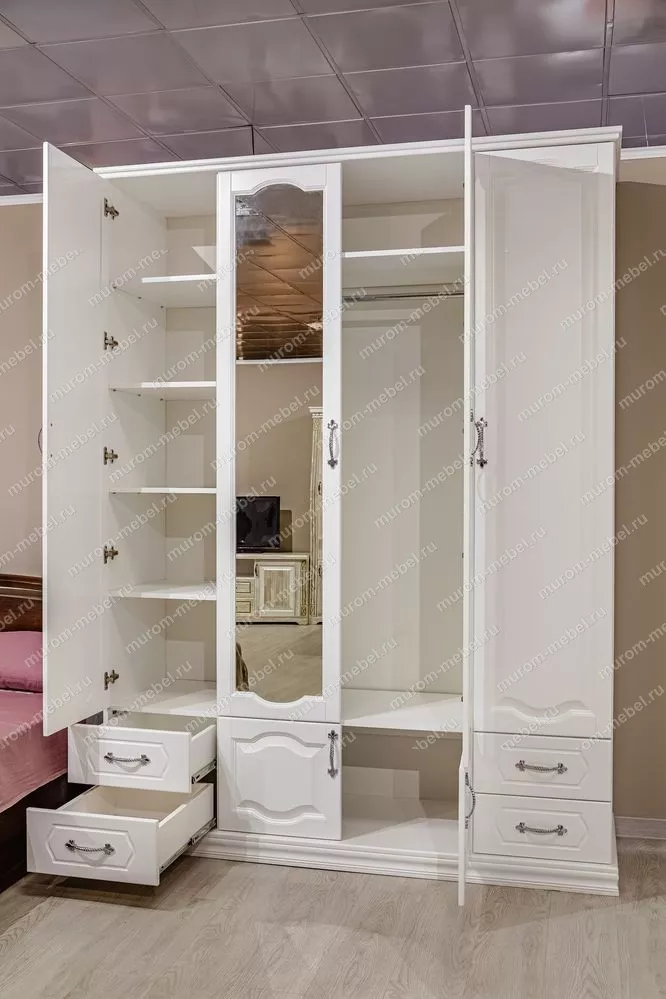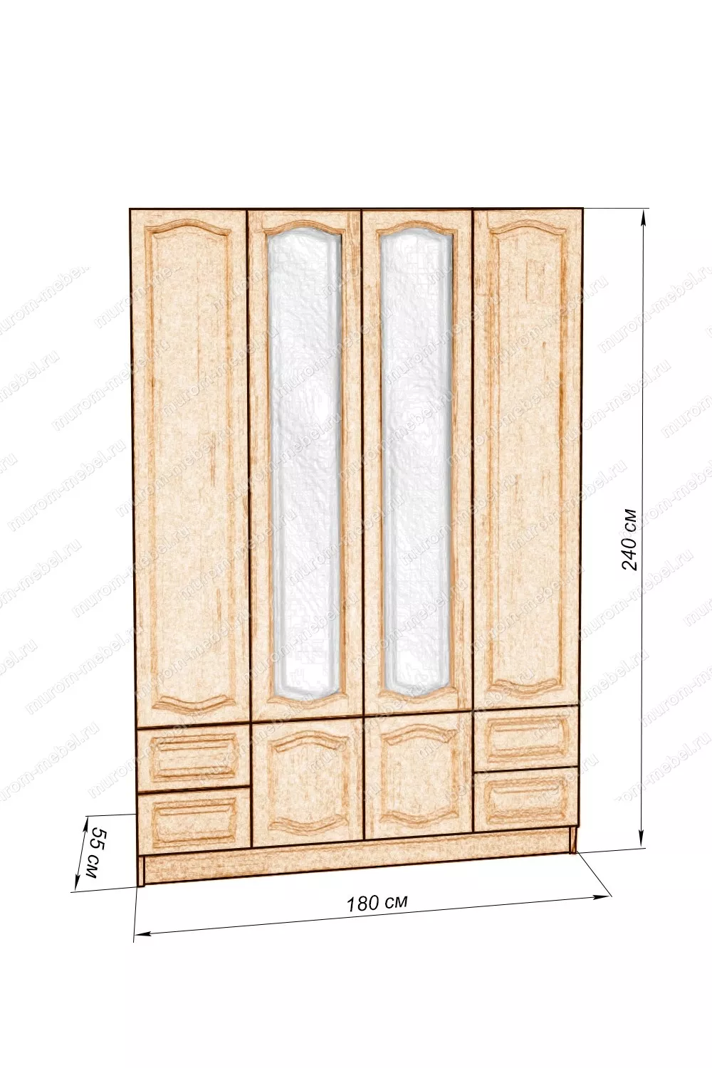 Высокий 4-х створчатый шкаф Лира характеризуется отличной вместительностью. Он имеет богатое внутреннее наполнение, поэтому в нём найдётся место для большого количества вещей. Вся одежда будет храниться аккуратно и в быстрой доступности. Производители оснастили эту модель ящиками, полками и штангой. Зеркала на фасаде позволяют сразу оценить выбранный наряд и визуально увеличивают помещение.