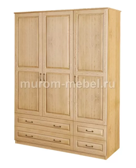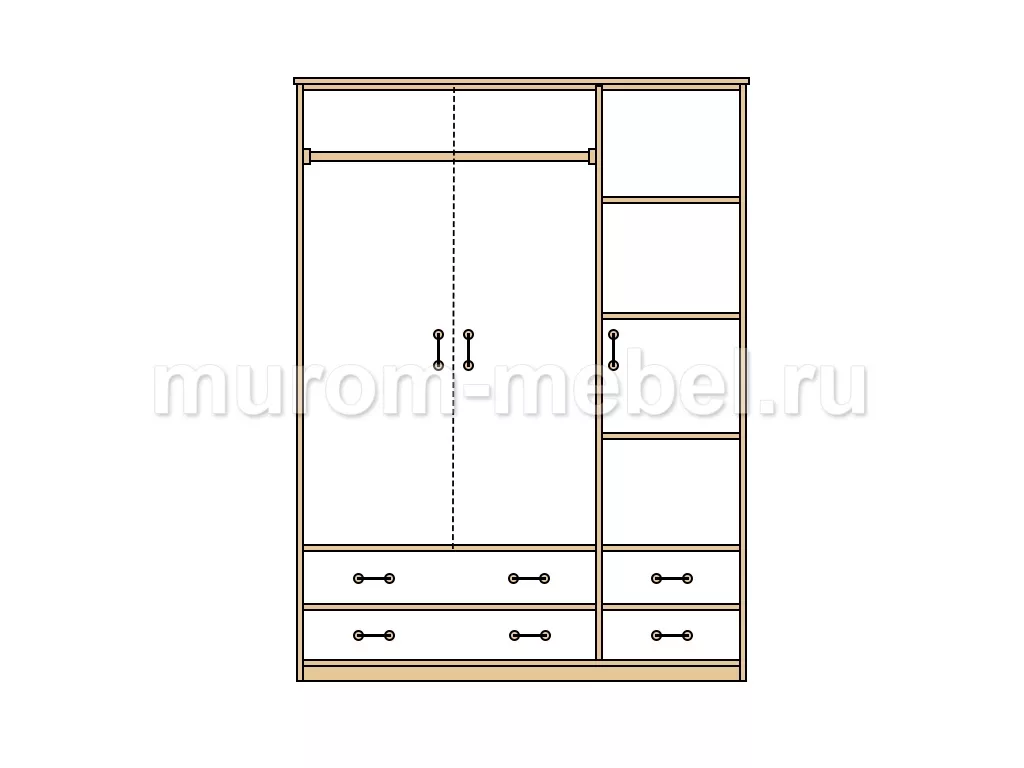 Шкаф ECO-18 обладает внушительными размерами, благодаря которым он является вместительным и отвечает своему функциональному назначению. Трехстворчатый ЕСО-18 разделен на две секции. Одна из них исполняет роль платяного шкафа, а другая является отделом с полками. Внизу каждый из отделов дополнен парой выдвижных ящиков. Итого, этот предмет мебели вмещает в себя 3 системы хранения с различными, но крайне полезными функциями. Внешний вид ЕСО-18 является олицетворением классического стиля.