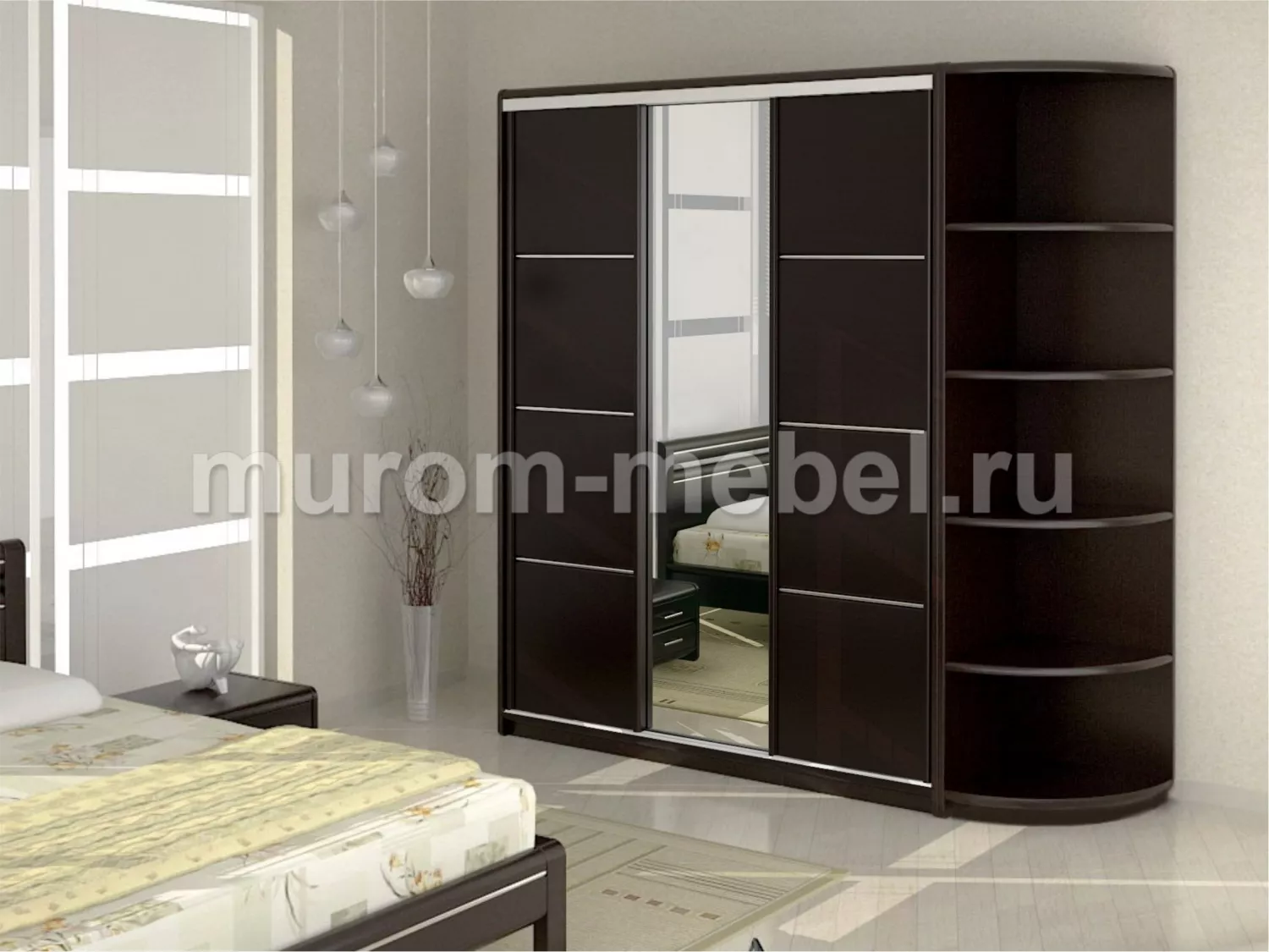Трёхстворчатый шкаф-купе Вермонт, дополненный угловым модулем с открытыми полками, подойдёт для просторных комнат. Он характеризуется высокой вместительностью. Бережно сохранит гардероб всей семьи. Оснащён устойчивыми полками и штангой.