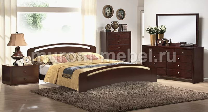 Роскошный, современный спальный гарнитур Бали Люкс изготовлен из экологически чистой древесины. Комплект мебели включает в себя комоды для хранения, тумбу, двуспальную кровать и большое зеркало.