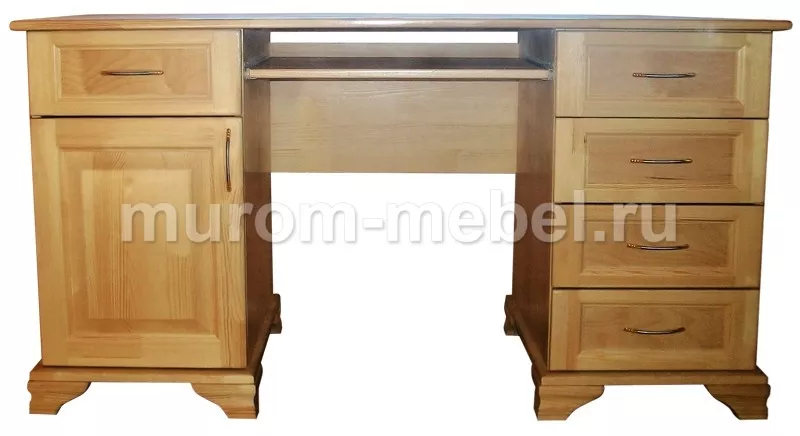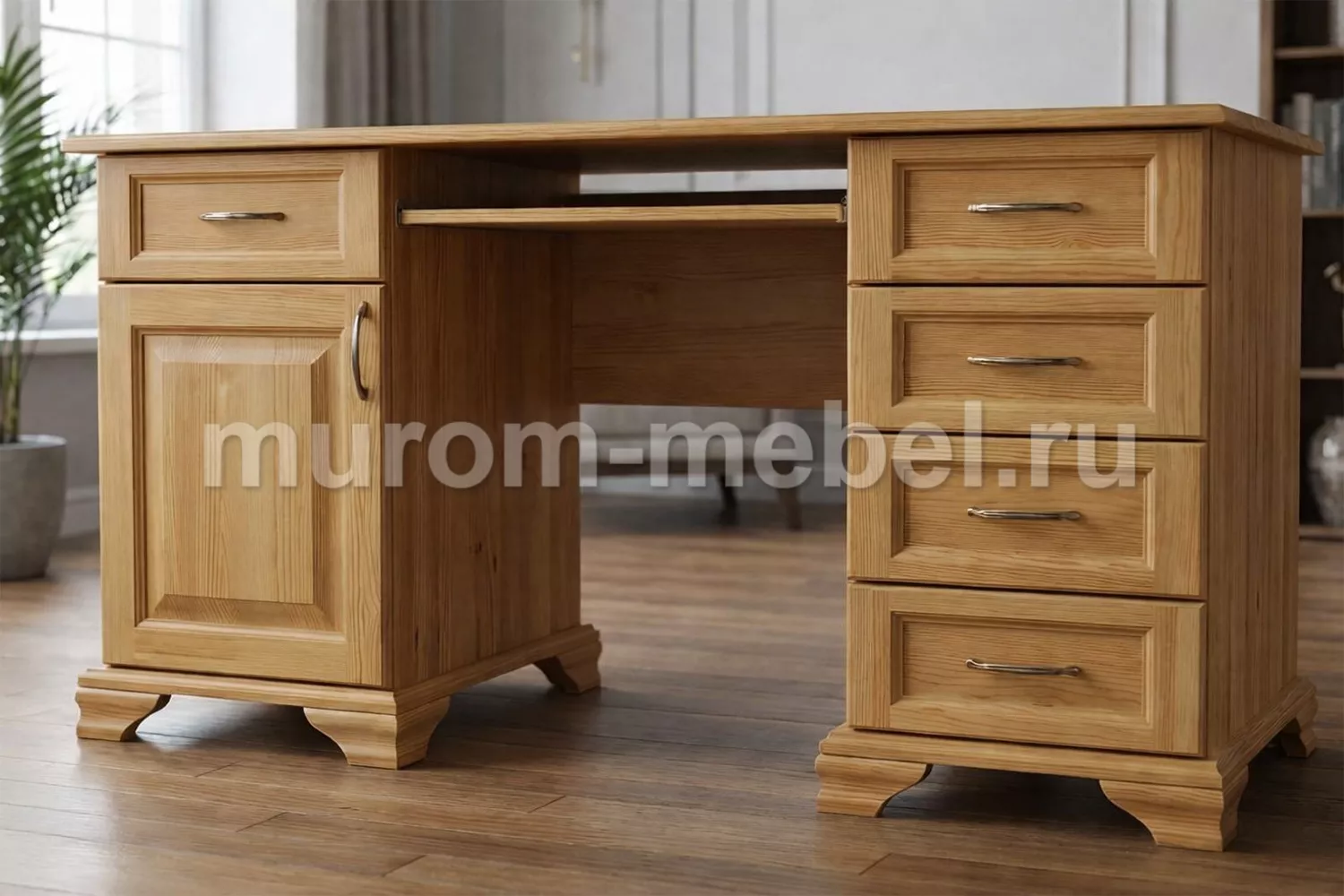 Светло-коричневый письменный стол в классическом стиле. В подстолье расположены выдвижные ящики и секция для хранения за распашной дверцей. Изготовлен из массива натурального дерева.